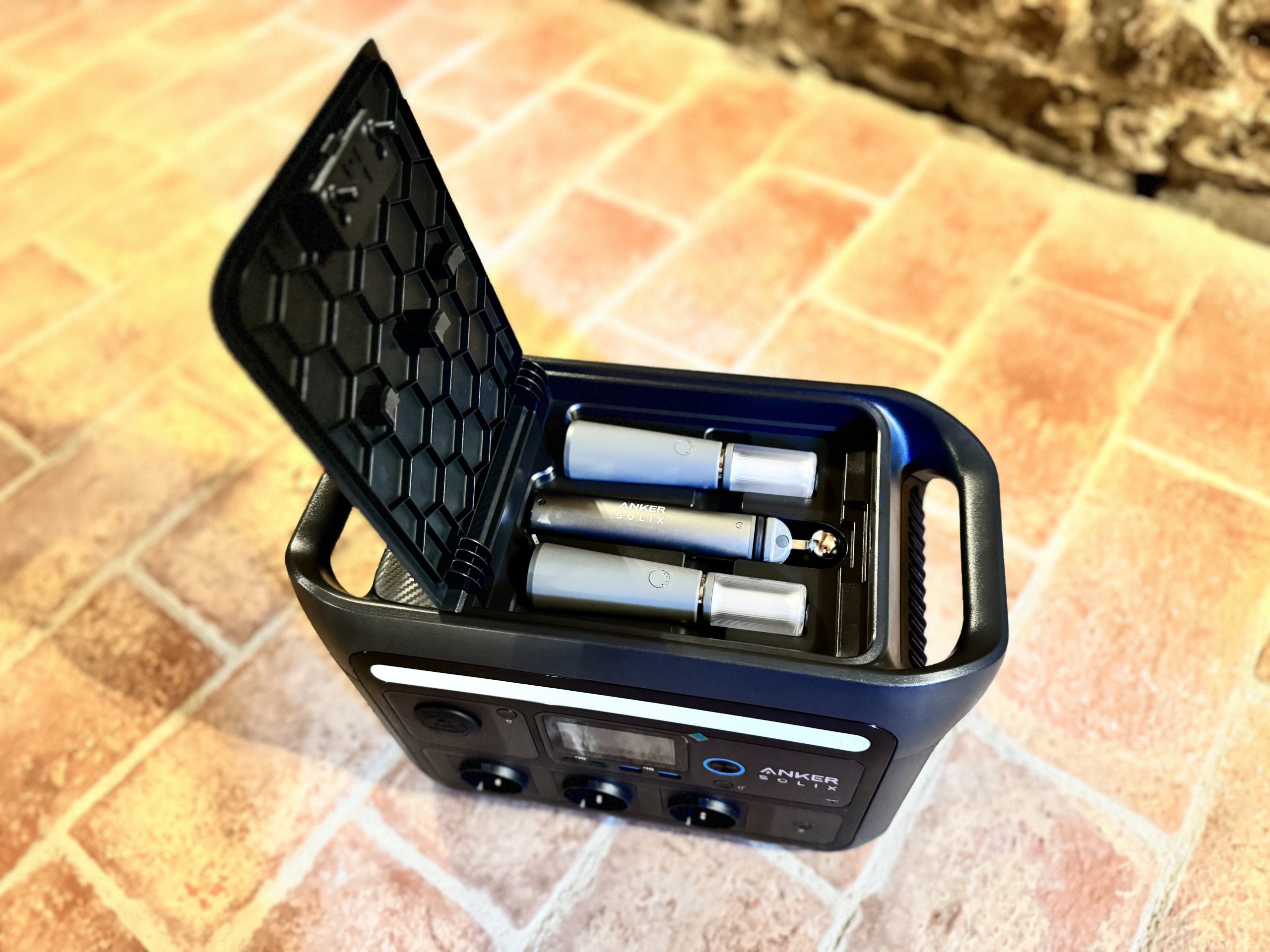Sub capacul superior, prins cu balama tip valiză, se află un compartiment etanș unde sunt adăpostite cablul AC, cablul auto de 12 V, două lămpi multifuncționale și stand ancorabil – detalii mici, dar care arată atenția Anker pentru „ecosistem”, disponibilitatea pentru o varietate stufoasă de scenarii de utilizare.