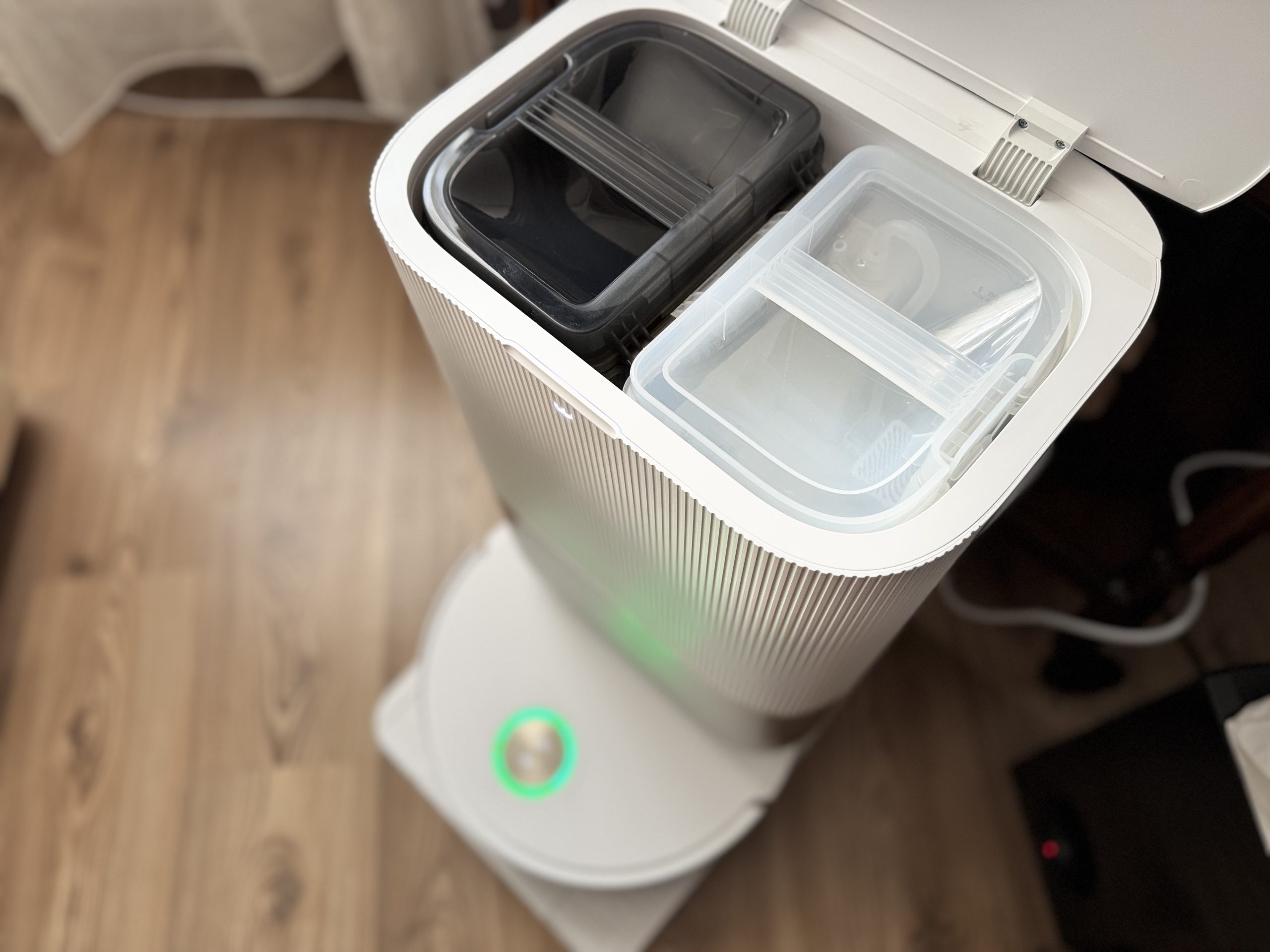 Stația de bază Complete (peste 22 kg) aduce trei rezervoare: apă curată, apă murdară și praf, plus funcție de uscare cu aer cald. Poți conecta direct apa și scurgerea, dar dacă nu ai un racord la îndemână, recipientele de 4,5 l se scot ușor cu mâner. Sacul de praf de 3,5 l permite până la 75 zile fără golire, iar mopurile se clătesc, se stoarce excesul și se usucă singure într-un ciclu de 2 ore, prevenind mirosurile.